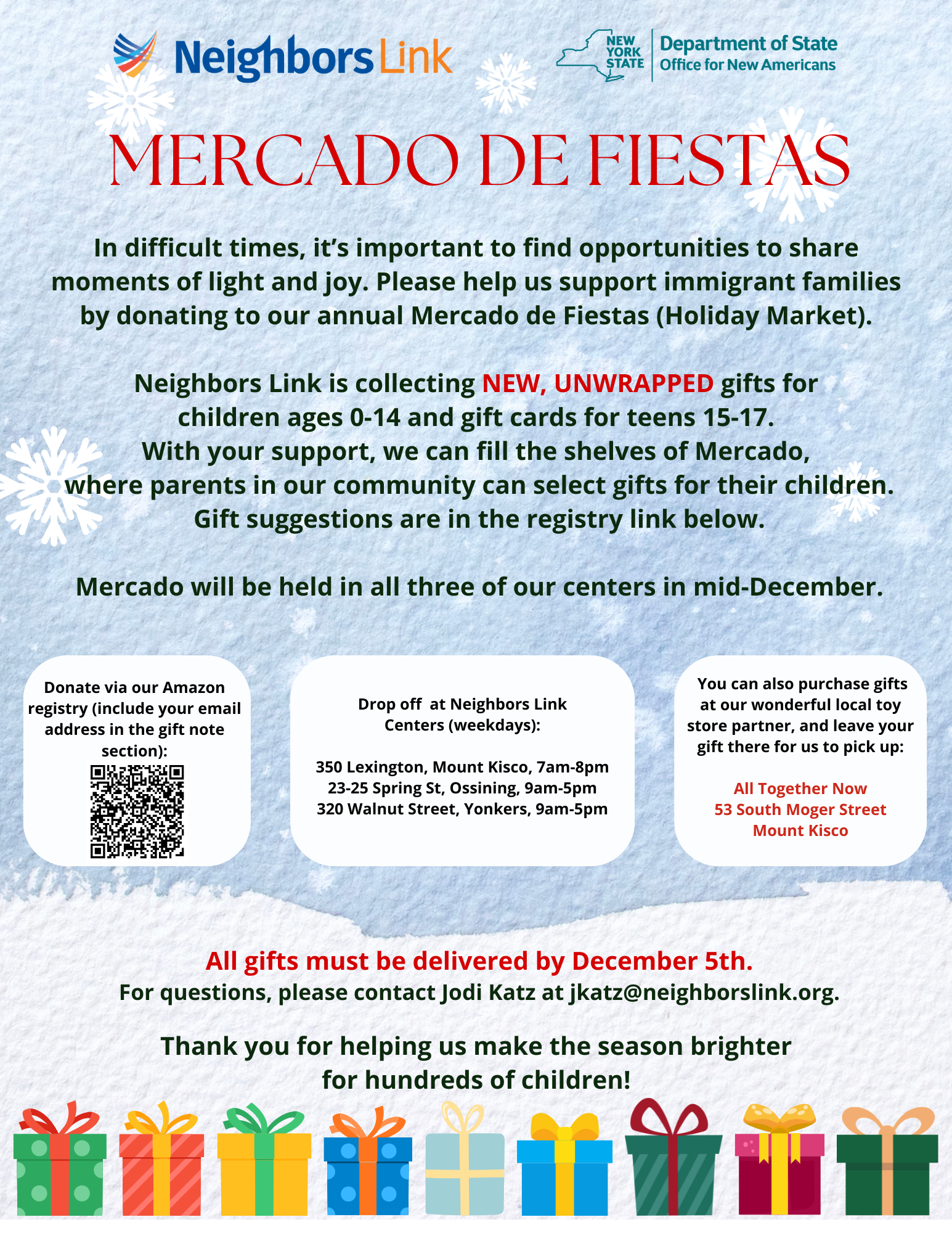 In difficult times, it’s important to find opportunities to share moments of light and joy. Please help us support immigrant families by donating to our annual Mercado de Fiestas (Holiday Market). Neighbors Link is collecting NEW, UNWRAPPED gifts for children ages 0-14 and gift cards for teens 15-17. With your support, we can fill the shelves of Mercado, where parents in our community can select gifts for their children. Gift suggestions are in the registry link below or by clicking here. Gifts can also be dropped off at any Neighbors Link center (details below). All gifts must be delivered by December 5th. For questions, please contact Jodi Katz at jkatz@neighborslink.org. Thank you for helping us make the season brighter for hundreds of children!